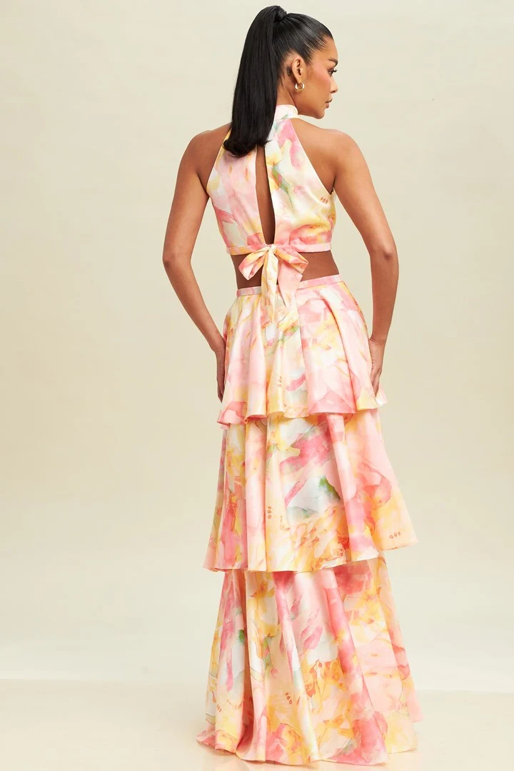 Coral Floral Print PANA SKIRT TIERED SET 100%POLYESTER